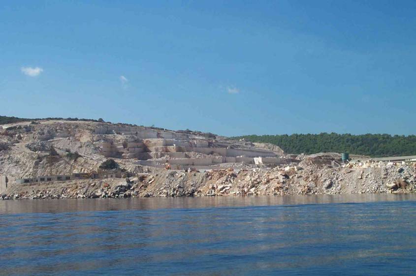 We untied from the anchor ball, Conrad testing Perception’s bow thrusters, and set off for Split - no wind, clear, 70F, seas mirror flat, directly west twenty miles along a broad channel from our harbor on the east edge of the north side of Brač island to Split on the south coast of the mainland, motoring all the way, and tracking the way points Fred and Conrad had shown me how to find on the chart by their longitude and latitude, 016şE20' 43şE17', and enter into the GPS the night before. Along the way we passed the huge stone quarry gradually eating the side of Brač island.