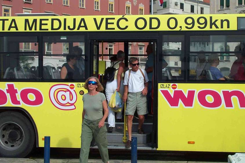 We walked from the marina, up a steep street to the west around the marina, stopping at a marine supply store to browse, then, deciding we were taking the long route, backtracked down the hill, through the neighboring marina, and along the busy street toward town. After a short wait at the bus stop, we caught a city bus, 8 kuna each ($1.40) and rode the short way around the harbor to the city, where the driver gestured us off the bus at the turnaround circle with the word, “polače.”